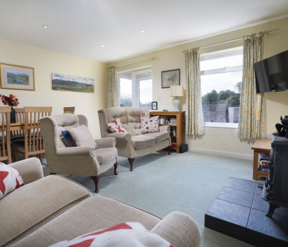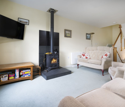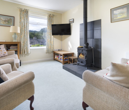 On the ground floor, there is a twin bedroom with en-suite bathroom (shower over bath) and a handy utility room with both a washing machine and a dryer. The middle floor is open-plan with the lounge area and the kitchen /dining area. The kitchen is well designed with plenty of storage and worktop space and fitted with quality appliances, to include a double oven and dishwasher. The lounge area has the benefit of both a woodburner and the superb view towards Lingmoor. Here, there is also a porch leading to the outdoor space where there is a bench for you to enjoy the fresh air and views across the valley.