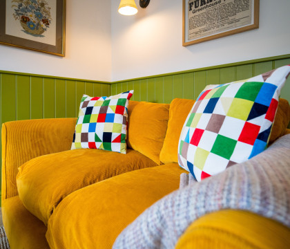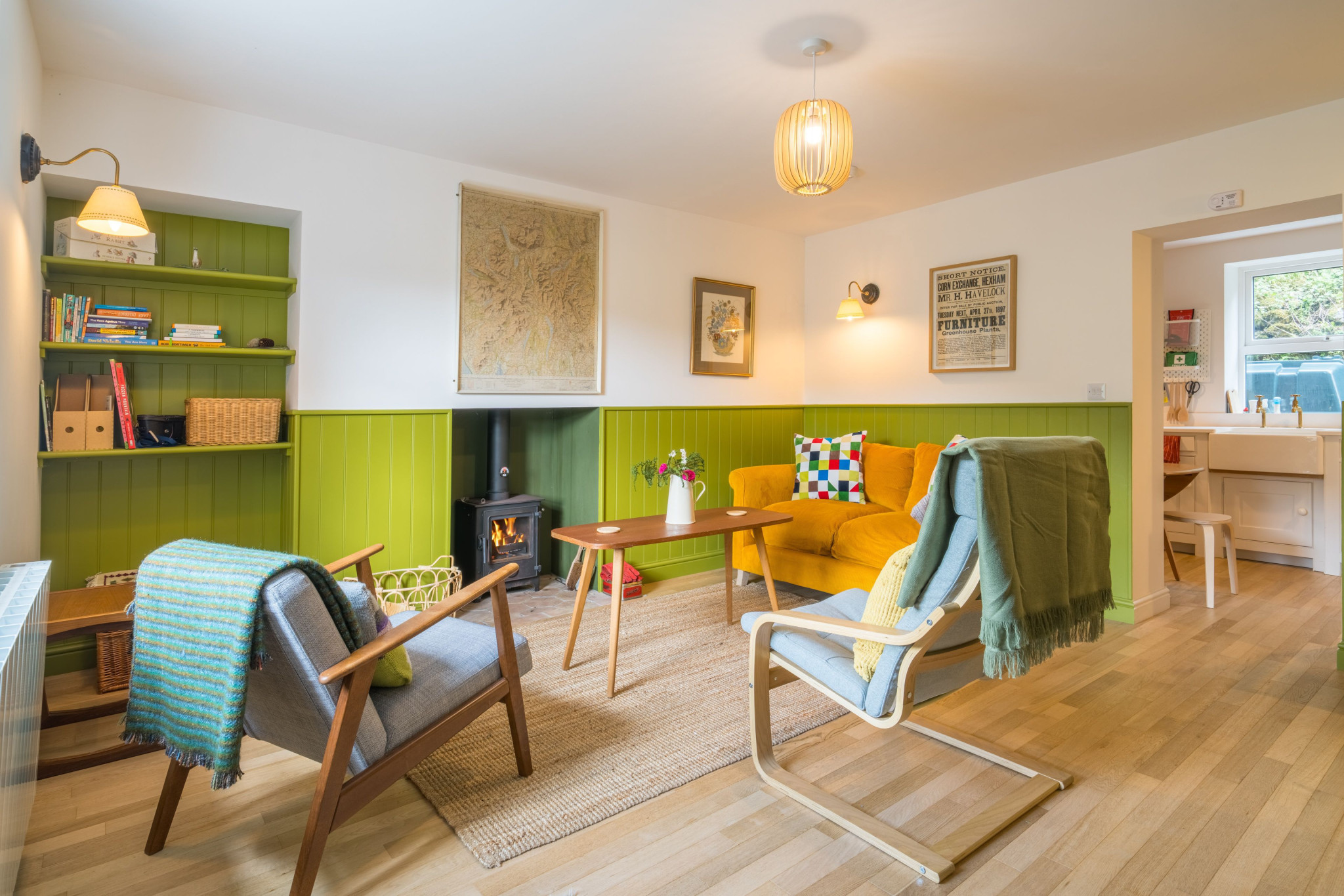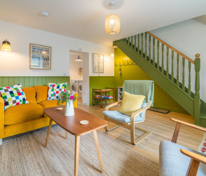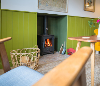 The owners have meticulously refurbished the cottage, creating a warm and inviting atmosphere. Inside, expect a blend of traditional features and modern design, enhanced by a great use of colour and local artwork. The comfortable lounge features a cosy log burner, a deep-cushioned sofa, and two easy chairs – perfect for relaxing while still admiring the views from the window. The modern kitchen is thoughtfully laid out with an electric oven, induction hob, washer, dryer, microwave, kettle, toaster, and a small dining table (please note: no dishwasher). Upstairs, the double bedroom at the front of the house offers the most magnificent views across the valley, and the bathroom includes a good-sized bath with an overhead shower and a heated towel rail.