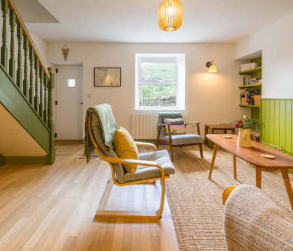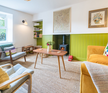The owners have meticulously refurbished the cottage, creating a warm and inviting atmosphere. Inside, expect a blend of traditional features and modern design, enhanced by a great use of colour and local artwork. The comfortable lounge features a cosy log burner, a deep-cushioned sofa, and two easy chairs – perfect for relaxing while still admiring the views from the window. The modern kitchen is thoughtfully laid out with an electric oven, induction hob, washer, dryer, microwave, kettle, toaster, and a small dining table (please note: no dishwasher). Upstairs, the double bedroom at the front of the house offers the most magnificent views across the valley, and the bathroom includes a good-sized bath with an overhead shower and a heated towel rail.