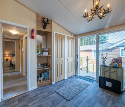 The outside space includes the decking area with furniture enclosed with glass balustrades, and the surrounding grass area has additional outdoor seating. Unfortunately, barbecues are not permitted. Antler Lodge sits up against the wooded area, with tall trees attracting wildlife and birds.