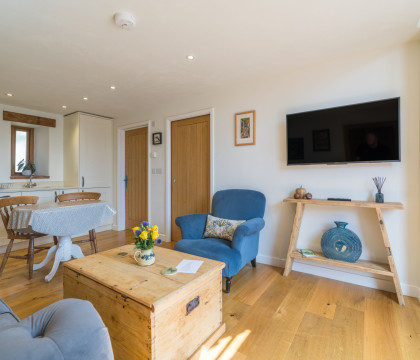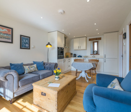 The property is a modern barn conversion all on one level, and is fitted out to a very high standard with comfort in mind. Take your seat in the light and airy lounge area and relax while planning your days out to come. If the weather is nice, there is a lovely lawned area with seating (shared with the owners who live in the adjoining property) and also a covered area with seating which is also handy if you want to store any bikes or outdoor gear. The kitchen is very well set up with modern cupboards and appliances with all you will need to create meals or snacks. The bedroom is decorated in muted tones and a peaceful night's sleep will be yours - no street noise in this most quiet of villages. Top-notch bathroom facilities with a mains-fed shower.