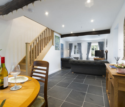 Ascend the beautiful oak staircase to the two bedrooms and bathroom. The double bedroom is a relaxing haven adorned with an original beam, and there is good all-round space and a built-in wardobe. The twin room (2'6" width beds) can be configured as a Kingsize bed if preferred (please request your preference when booking). The twin room enjoys a view over the garden /orchard area. Also on this floor is the house bathroom which has a good-size walk-in shower and heated towel rail.