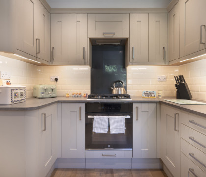 The open plan lounge/dining area provides plenty of space and is furnished with two very good sofas strategically positioned to enjoy both the TV and the woodburning stove. The dining table seats four in comfort and is just a few steps from the kitchen. An interesting display of Beatrix Potter crockery has an interesting connection - the owner's grandfather was the inspiration for the Beatrix Potter character 'Farmer Potatoes'. A few steps to the smart kitchen area and utility area beyond with a washer and dryer plus a handy extra WC. Air source underfloor heating keeps steady temperature but the woodburner can also be used of course for extra heat and ambience.