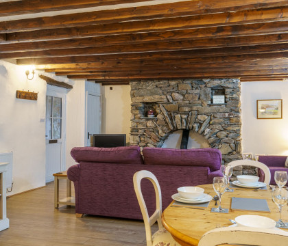 • Open plan living and dining area with a wooden floor and an original stone fireplace that surrounds the wood-burning fire. Two comfortable three-seat sofas and a 40-inch smart TV. Four-place dining table and chairs. Selection of books and games.