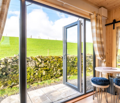 This Lake District Glamping Pod benefits from electric heating, mains electricity, and plumbed-in facilities. It also offers views overlooking open farmland, grazing cows, and sheep.