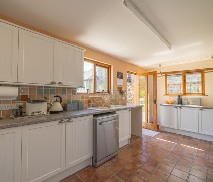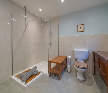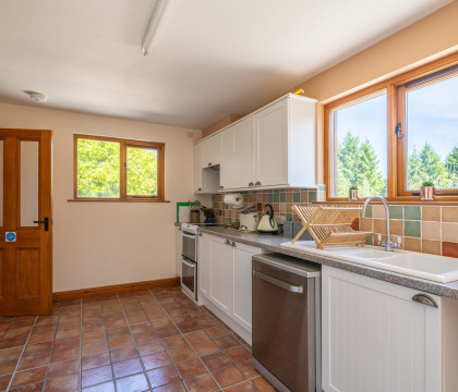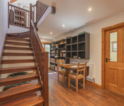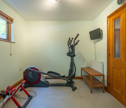 The property is approached on a private drive, set back a little way off the road and has plenty of parking space. Enter the property via the kitchen, which is well planned out, with plenty of storage and preparation space. Also, here on the ground floor, is a mini-library area with a table and chairs for a quick brew or snack. The bathroom is also on the ground floor and has a good-sized walk-in shower, basin and WC. Next to the bathroom is a great space for storing outdoor gear / muddy boots, and this area also has the unusual feature of static training bikes, and a cross trainer, which guests may use (subject to being used with care). Upstairs to the lounge and bedrooms. The lounge is really spacious with ample room for the sofas and the dining table and for a bit of fun, there's table football for you - family tournament anyone? Both bedrooms are spacious and peaceful - there's a double and a twin. There are views over the countryside from the lounge and the twin bedroom.