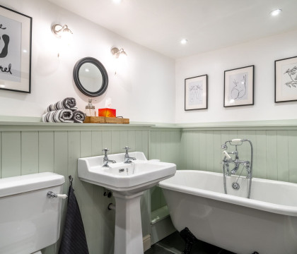 Also on the ground floor is the delightfully decorated bathroom which has a stood bath with a hand-held shower attachment, a loo and a basin.