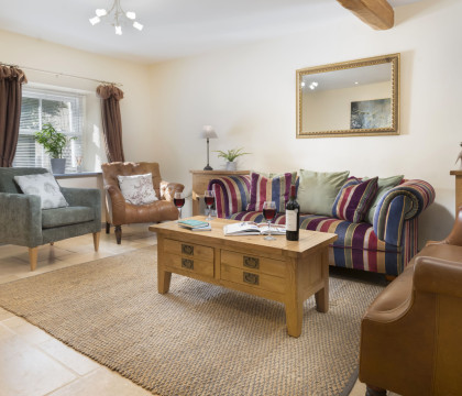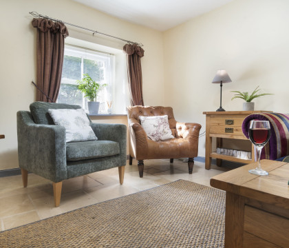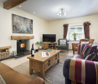 • Living Room – Two two-seat sofas, two armchairs, Smart flatscreen TV + DVD player, log-burning fire with a complimentary wood supply, and firelighters.