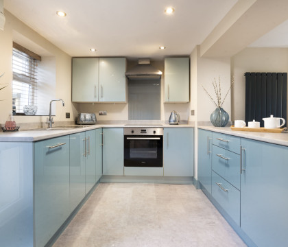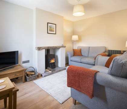 Downstairs is decorated in muted tones and divided between the cosy lounge, and the open plan kitchen / dining area. The lounge has a great logburner, smart TV, and comfortable seating for four. The kitchen has contemporary style fittings with good storage cupboards and worktops. There is a comprehensive inventory of equipment and all the conveniences you would expect. Upstairs to the two bedrooms, one Kingsize and the other is a standard double; both rooms have solid wood furniture. The house bathroom has a very good-size walk-in shower and a crisp modern look, with tiling throughout.Guests who may have a pet allergy can be assured that dogs are not permitted here.
