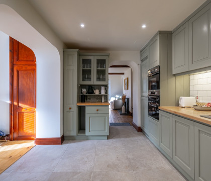 • Kitchen: Spacious with wooden worktops, a tiled floor, an electric double oven, an induction hob, a fridge, a freezer, a dishwasher, a microwave, a toaster, a kettle, and ample cupboard storage.